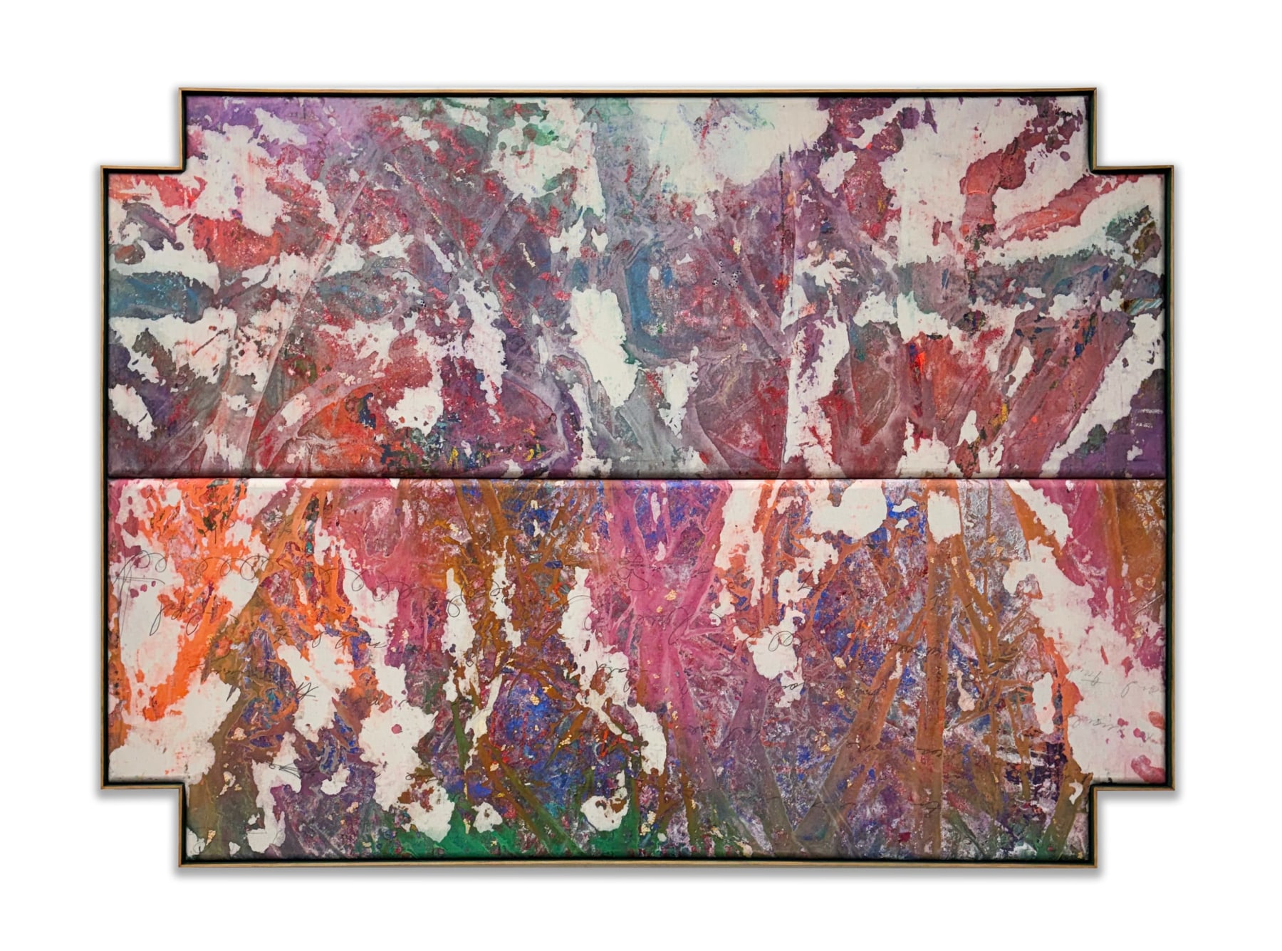 Layered abstract painting, incorporating various material processes, characterize the work of Ben Pritchard (b. 1970), Seffa Klein (b. 1996), Kadar Brock (b. 1980), Basie Allen (b. 1989), Astrid Dick (b. 1972), and Quentin Curry (b. 1972). Curry layers stone dust and paint to create highly textured compositions with areas of three-dimensional relief. Drawing upon natural forms such as leaves and rocks, Curry’s paintings and sculptures suggest a reinterpretation of ancient pictographs. Allen is a poet and painter who mines his experiences living in urban and rural spaces. Through a process of layering text, paint, collage, and transfer, Allen mimics the dimensional chaos of a city or natural landscape. Brock layers multiple compositions atop one another, which become merged through continued erasure and reworking of the surface. He mimics the quality of weathered cloth or aged fresco, with surfaces that are worn, abraded, cracked, and torn. Dick uses alternate materials and supports to create a patterned painting world characterized by its directness and merging of “high and low.” Canvases may be completely covered in glitter, while other paintings layer oil on top of foam or crushed glass. Pritchard paints thickly-impastoed abstractions combining interlocking geometric shapes with organic forms and drips. Pritchard sees his paintings—defined by gritty accumulations of color—as reflections of layered memory. Klein is a French-American artist whose work is grounded in the intersection of science, aesthetics, and meditation. She paints in acrylic on heat-resistant woven glass canvas and applies a plaster bas-relief, forming a skeletal structure, before gilding the surface with molten bismuth metal.